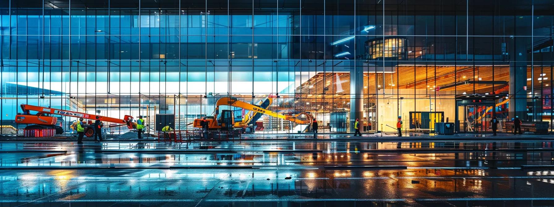 a skilled contractor meticulously applies waterproofing material on a multi-layered rooftop, surrounded by tools and safety equipment under bright, artificial workspace lighting, emphasizing the precision and professionalism required for a successful roof repair project.
